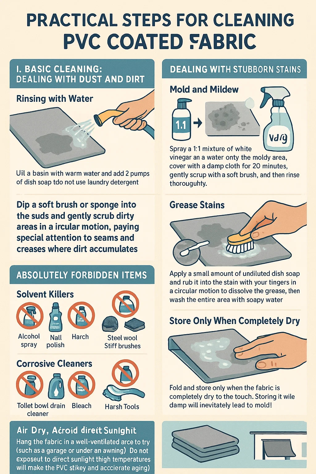 Aer siccus, fuge Direct Solem: fabricam suspende in area bene ventilata ad siccandum (ut garage vel sub vela). Noli eam exponere ad solis lumen directum (caliditas temperaturas PVC lentum faciet et senescentem accelerabit).