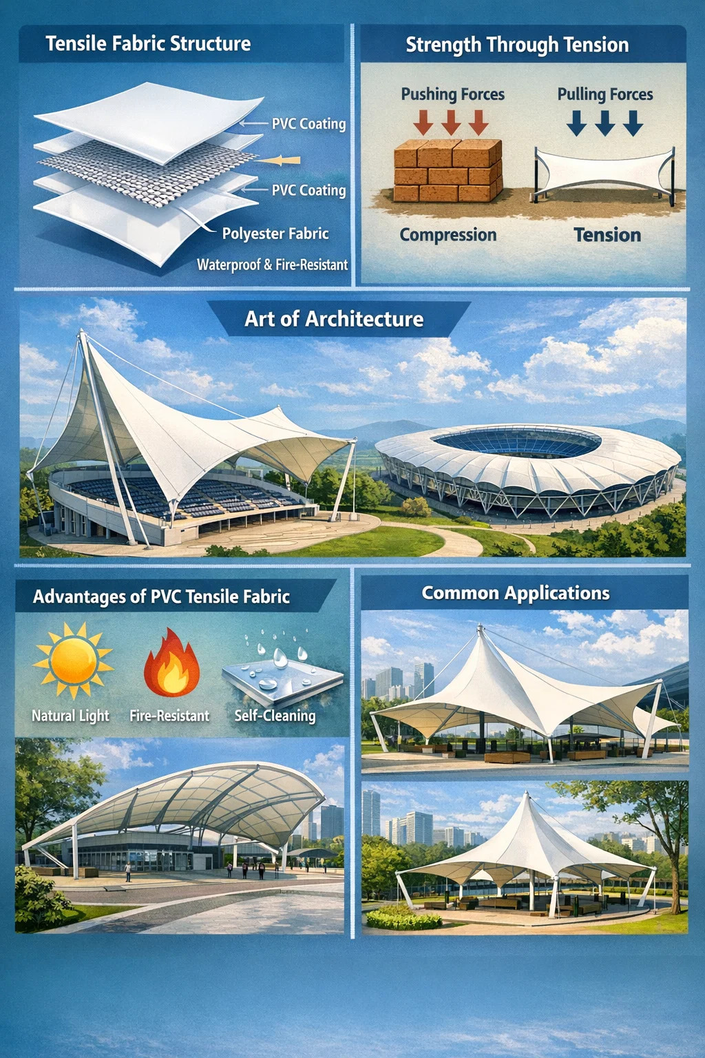 Frequentissimum exemplum huius materiae est PVC distrahentes fabricae . Potes cogitare eam ut "pellis" aedificii.