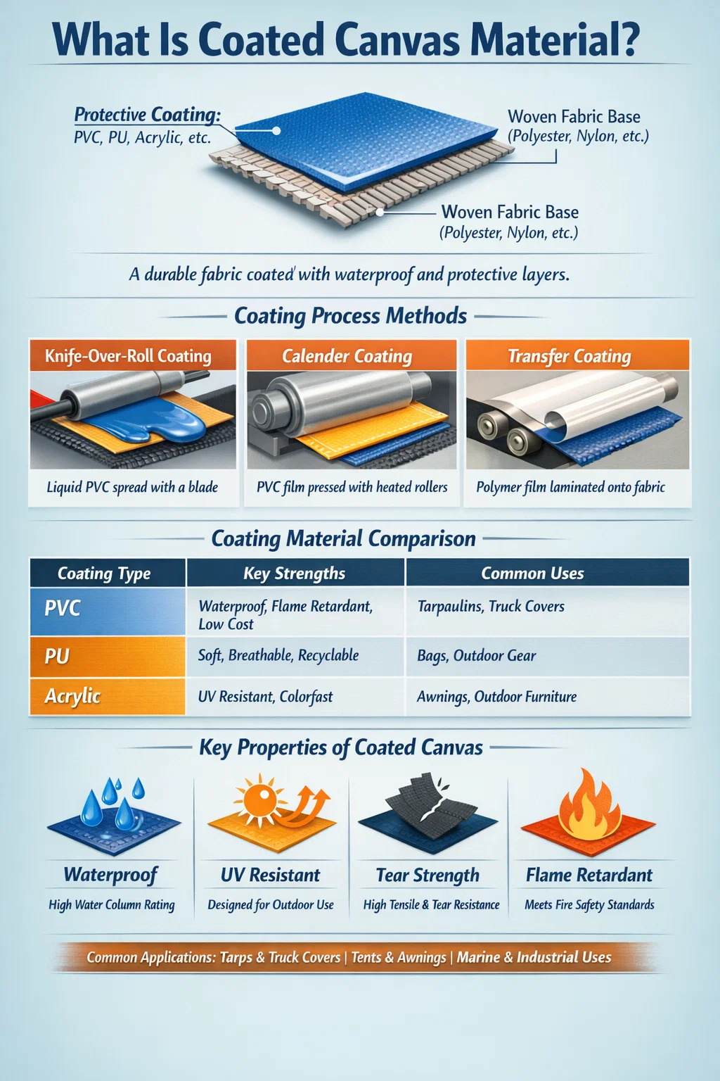 The coating chemistry defines the performance envelope of the finished material. Below is a comparison of the major coating types used in coated canvas production today.