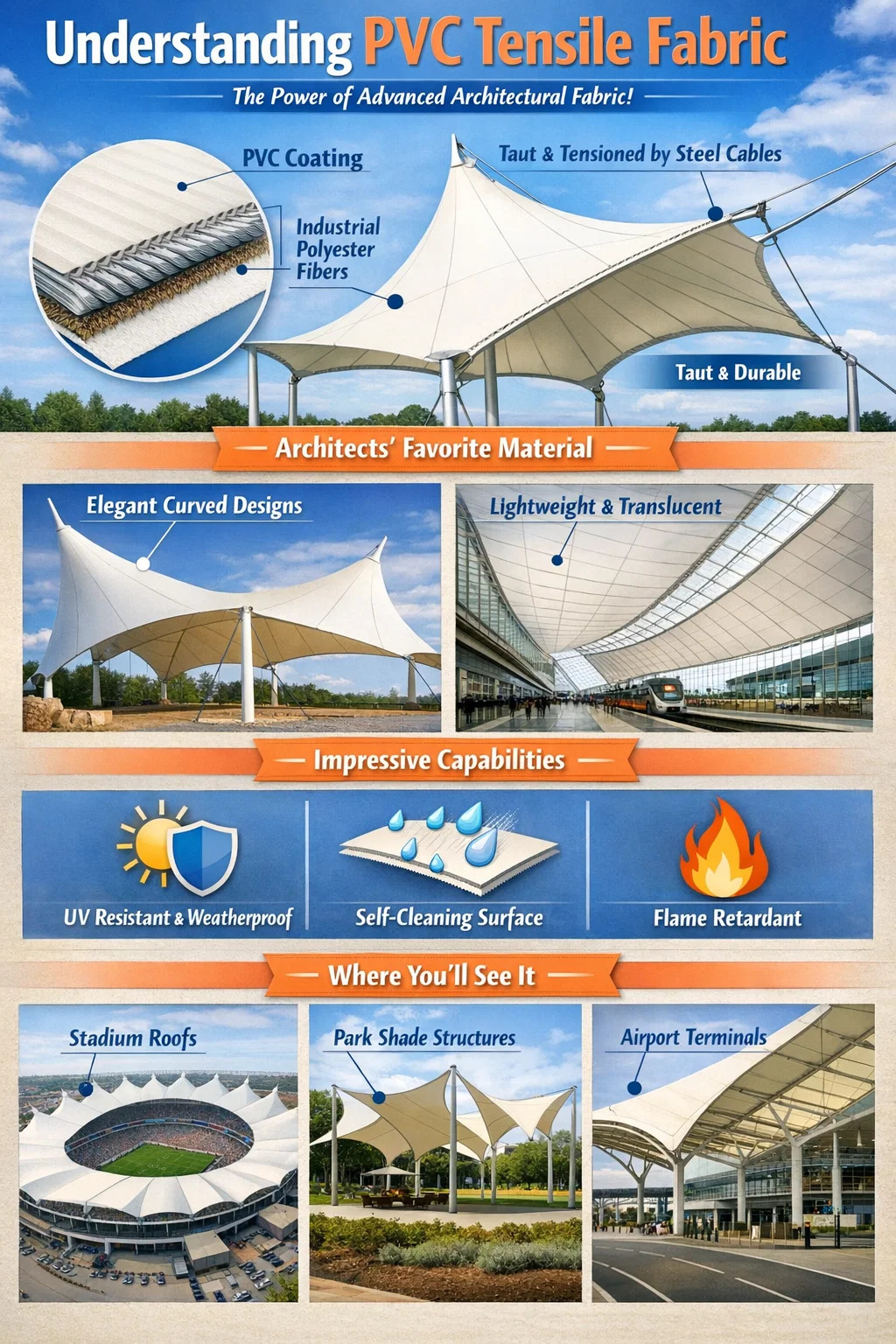 Figurae versatiles: In ephippiis formis, tentoriis figuris seu variis curvis elegantibus intendi potest. Saepe videbis has artis figuras in stadiis, theatris apertis, aut in structuris raedis summum finem.